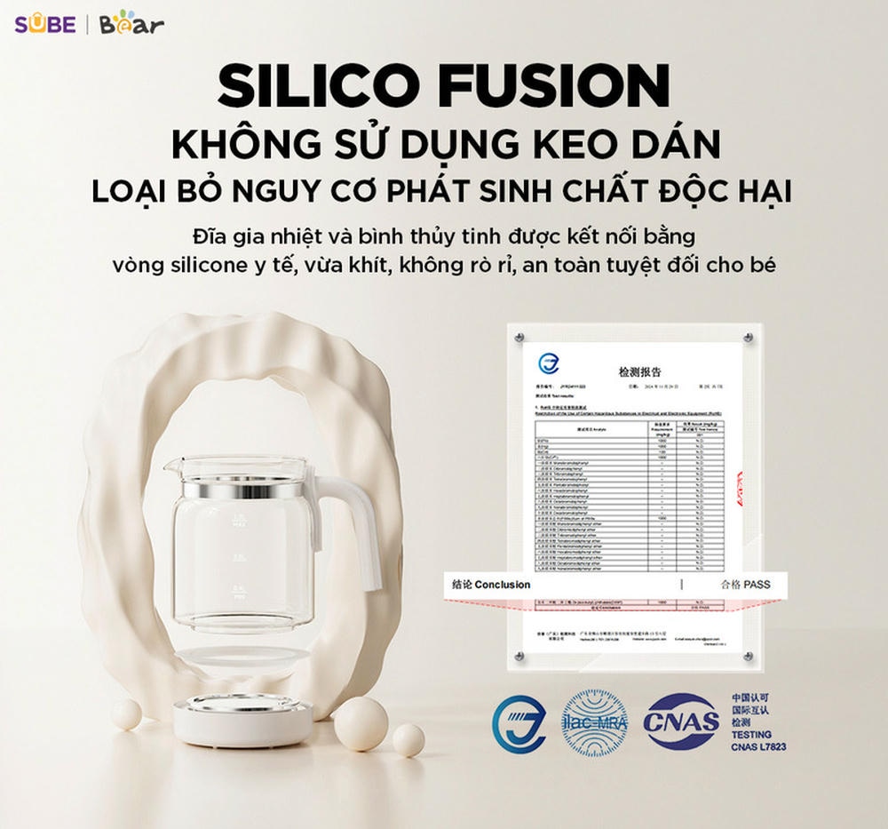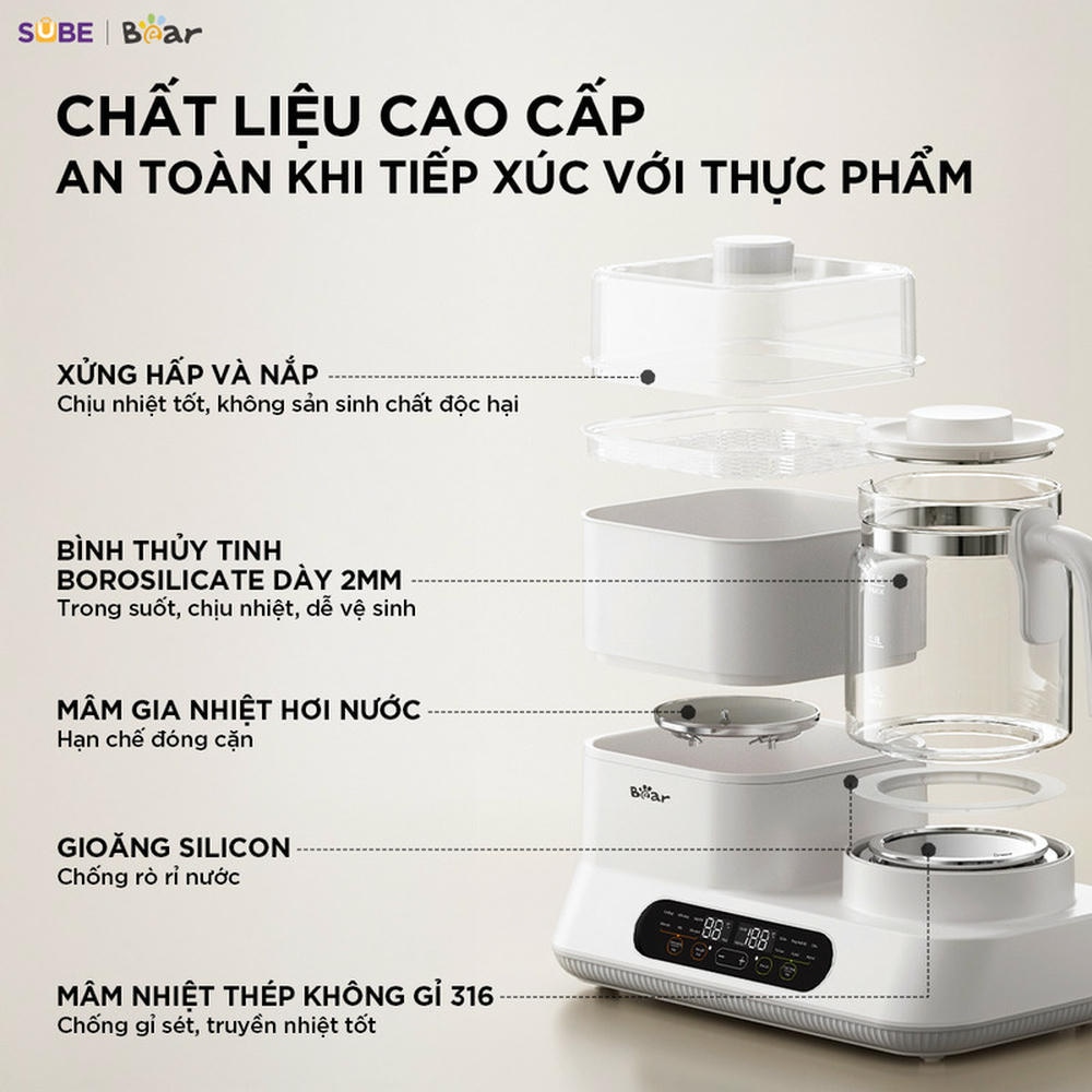 Bình thủy tinh Borosilicate chịu nhiệt sốc, không độc hại. Mâm nhiệt Inox 316 chuẩn y tế chống gỉ tốt. Kết nối bằng vòng silicone thực phẩm, không dùng keo dán.