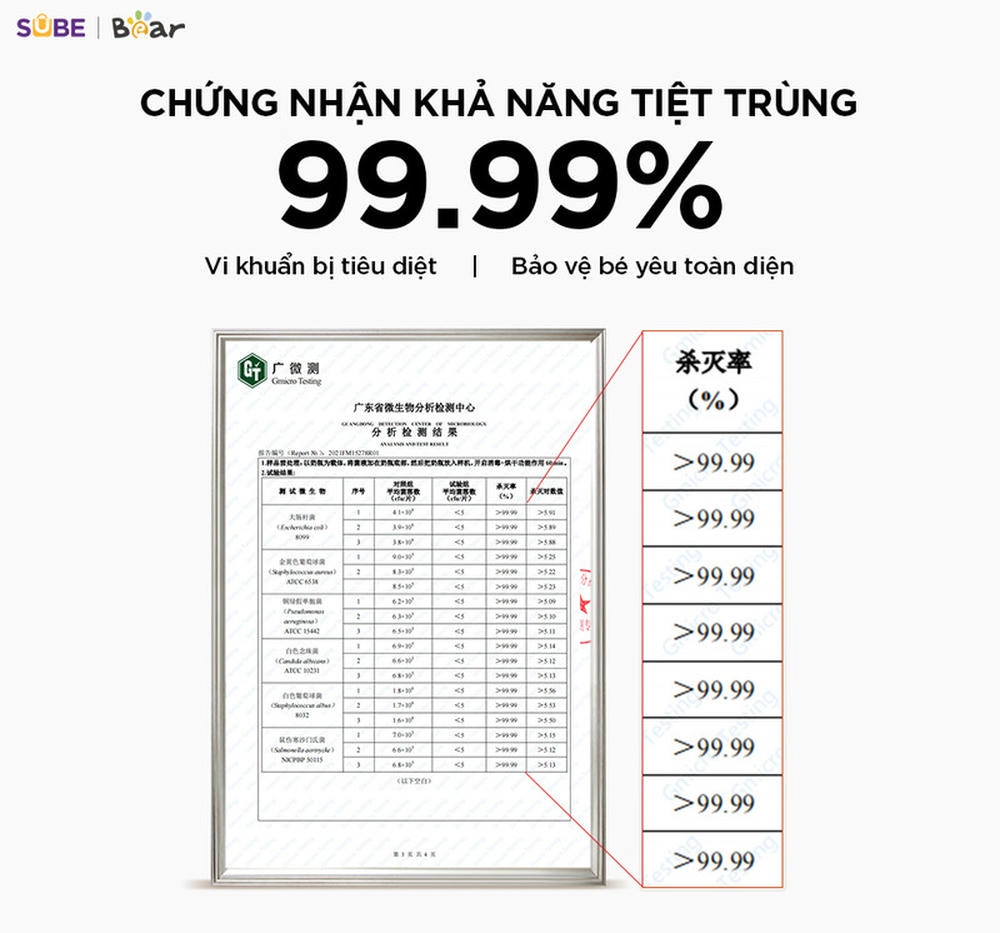 Hơi nước 100°C tiêu diệt đến 99.99% vi khuẩn. Sau đó, khí nóng PTC làm khô hoàn toàn bình và núm ti. Chế độ bảo quản vô trùng 72 giờ nhờ tự động sấy lại mỗi 3 giờ.