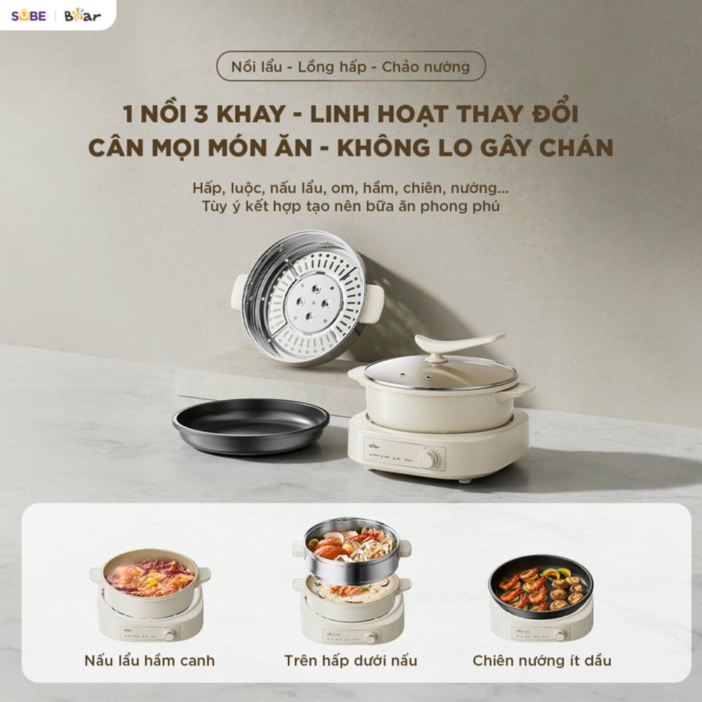 Nồi Bear HOP-505QT cho phép chế biến đa dạng món ăn chỉ với một thiết bị duy nhất. Các khay nấu tách rời linh hoạt giúp bạn dễ dàng chuyển đổi giữa các chế độ nấu.