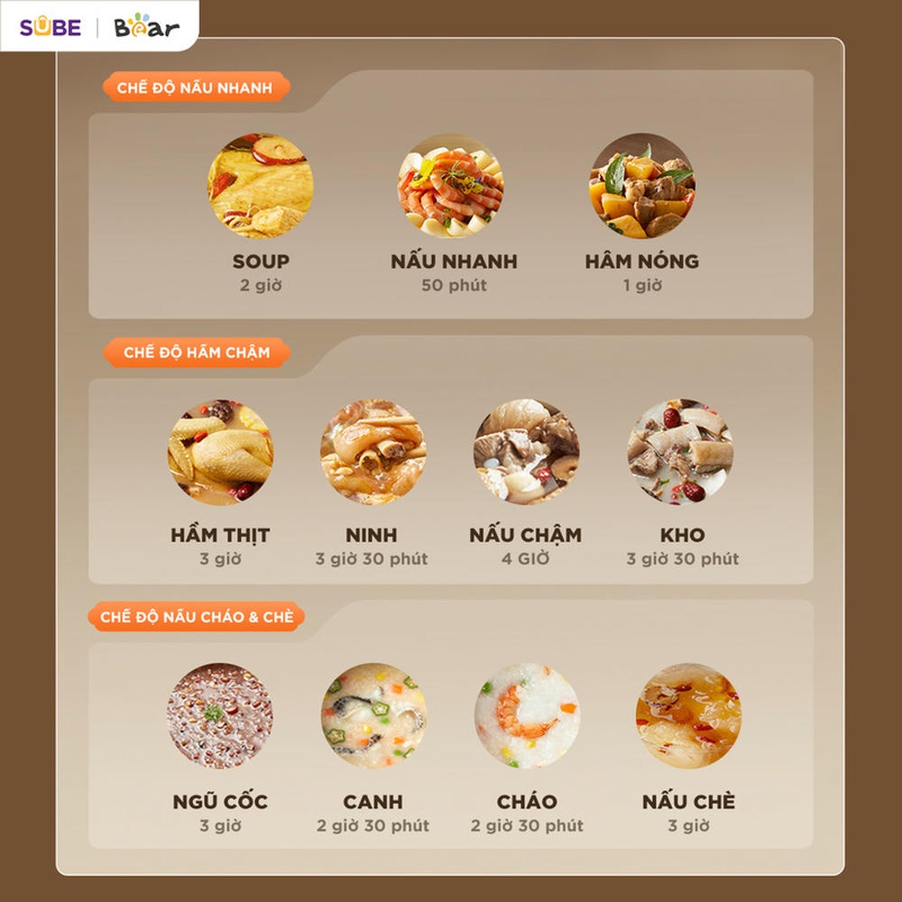 Nồi tích hợp sẵn 12 chức năng như hầm thịt, kho, soup, ninh, nấu chậm, nấu nhanh, ngũ cốc, canh, hâm nóng, cháo dinh dưỡng, nấu chè và giữ ấm. Người dùng chỉ cần chọn chế độ phù hợp là có ngay món ăn mong muốn.